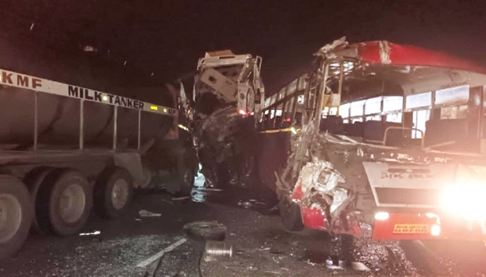 ಹಾಸನ: ಕೆಎಸ್ಆರ್ ಟಿಸಿ ಬಸ್, ಟ್ಯಾಂಕರ್, ಟಿಟಿ ವಾಹನದ ನಡುವೆ ನಡೆದ ಭೀಕರ ಅಪಘಾತದಲ್ಲಿ 9 ಜನ ಸಾವನ್ನಪ್ಪಿದ ಘಟನೆ ತಡರಾತ್ರಿಯ ಅರಸೀಕೆರೆ ತಾಲೂಕಿನಲ್ಲಿ ನಡೆದಿದೆ.