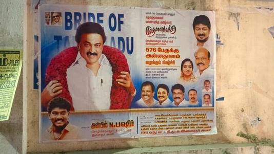 ಈ ಪೋಸ್ಟರ್ನಲ್ಲಿ ಎಂಕೆ ಸ್ಟಾಲಿನ್ ಅವರ ಚಿತ್ರವಿದೆ, ಅದರ ಮೇಲೆ ‘ತಮಿಳುನಾಡಿನ ವಧು’ (bride of tamilnadu ) ಎಂದು ಬರೆಯಲಾಗಿದೆ.