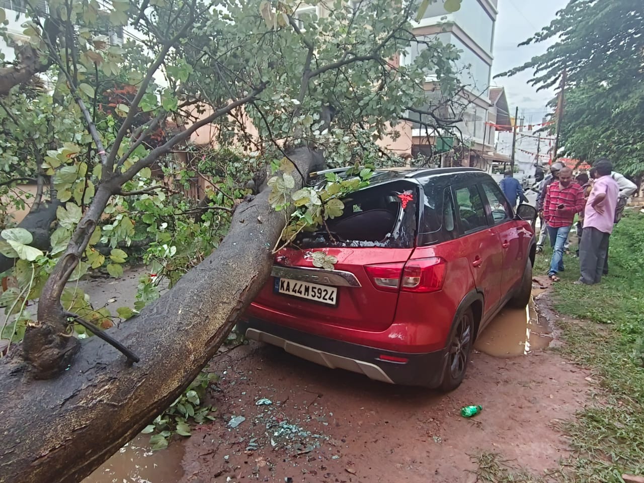 ಧಾರಾಕಾರವಾಗಿ ಮಳೆಗೆ ಧರೆಗುರುಳಿದ ಮರ: ಕಾರು, ಬೈಕ್ ಜಖಂ
