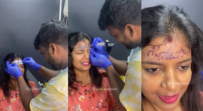 ಬೆಂಗಳೂರಿನ ಮಹಿಳೆಯೊಬ್ಬರು ಹಣೆಯ ಮೇಲೆ ಪತಿಯ ಹೆಸರನ್ನು ‘ಸತೀಶ್’ ಎಂದು ಹಚ್ಚೆ ಹಾಕಿಸಿಕೊಂಡಿದ್ದಾರೆ. ಬೆಂಗಳೂರಿನ ಕಿಂಗ್ ಮೇಕರ್ ಟ್ಯಾಟೂ ಸ್ಟುಡಿಯೋದಲ್ಲಿ ಈ ಘಟನೆ ನಡೆದಿದೆ. ಟ್ಯಾಟೂ ಸ್ಟುಡಿಯೋ ಸ್ವತಃ ತನ್ನ ಇನ್ಸ್ಟಾಗ್ರಾಮ್ ಪುಟದ ಮೂಲಕ ವೀಡಿಯೊವನ್ನು ಹಂಚಿಕೊಂಡಿದೆ.