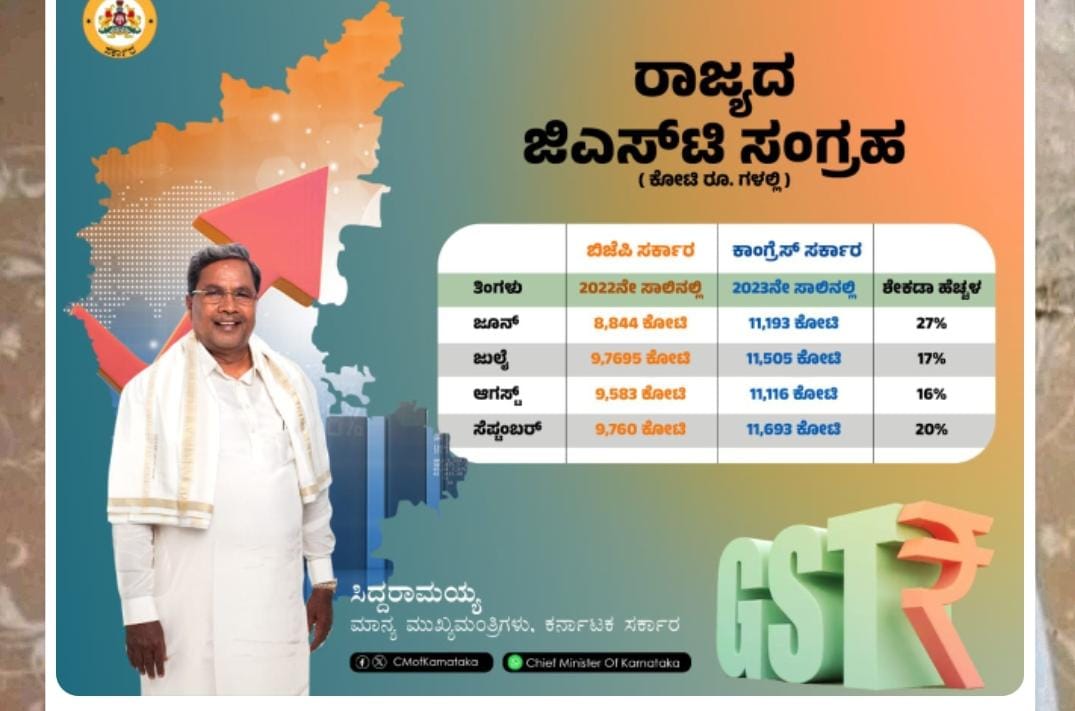 ಮಂದಗತಿಯಲ್ಲಿ ಸಾಗುತ್ತಿದ್ದ ರಾಜ್ಯದ ವ್ಯಾಪಾರ ವಹಿವಾಟು ನಮ್ಮ ಗ್ಯಾರಂಟಿ ಯೋಜನೆಗಳ ಜಾರಿ ನಂತರ ಗರಿಗೆದರಿದೆ. ಈ ಕಾರಣಕ್ಕಾಗಿ ಸೆಪ್ಟೆಂಬರ್ ತಿಂಗಳ ಸರಕು ಮತ್ತು ಸೇವಾ ತೆರಿಗೆ ( ಜಿ.ಎಸ್.ಟಿ ) ಸಂಗ್ರಹದಲ್ಲಿ ಭಾರೀ ಹೆಚ್ಚಳವಾಗಿದ್ದು, ಕಳೆದ ವರ್ಷದ ಸೆಪ್ಟೆಂಬರ್ ತಿಂಗಳ ಸಂಗ್ರಹಕ್ಕಿಂತ ಶೇ. 20 ಪ್ರಗತಿ ಕಂಡಿದೆ. ಸೆಪ್ಟೆಂಬರ್ ನಲ್ಲಿ ರೂ. 11,693 ಕೋಟಿ ಜಿಎಸ್ ಟಿ ಸಂಗ್ರಹವಾಗಿದ್ದು, ಇದು ರಾಜ್ಯದ ಆರ್ಥಿಕ ಬೆಳವಣಿಗೆಯ ದಿಕ್ಸೂಚಿ ಎಂದು ಭಾವಿಸಿರುವುದಾಗಿ ಸಿದ್ದರಾಮಯ್ಯ ಹೇಳಿದ್ದಾರೆ.