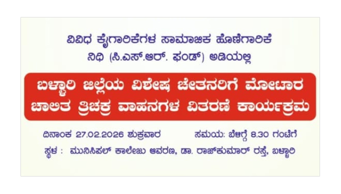 ಬಳ್ಳಾರಿ: ಜಿಲ್ಲಾಡಳಿತ, ಕಾರ್ಮಿಕ ಇಲಾಖೆ ಹಾಗೂ ಕಾರ್ಖಾನೆಗಳು, ಬಾಯ್ಲರುಗಳು, ಕೈಗಾರಿಕಾ ಸುರಕ್ಷತೆ ಮತ್ತು ಆರೋಗ್ಯ ಇಲಾಖೆ ಹಾಗೂ ವಿಕಲಚೇತನರ ಮತ್ತು ಹಿರಿಯ ನಾಗರಿಕರ ಸಬಲೀಕರಣ ಇಲಾಖೆ ಇವರ ಸಂಯುಕ್ತಾಶ್ರಯದಲ್ಲಿ ಫೆ.27 ರಂದು ಬೆಳಿಗ್ಗೆ 08:30 ಗಂಟೆಗೆ ನಗರದ ಡಾ.ರಾಜ್ ಕುಮಾರ್ ರಸ್ತೆಯ ಮುನಿಸಿಪಲ್ ಕಾಲೇಜು ಆವರಣದಲ್ಲಿ ಜಿಲ್ಲೆಯ ವಿವಿಧ ಕೈಗಾರಿಕೆಗಳ ಸಾಮಾಜಿಕ ಹೊಣೆಗಾರಿಕೆ ನಿಧಿ(ಸಿಎಸ್ ಆರ್) ಅಡಿ ಬಳ್ಳಾರಿ ಜಿಲ್ಲೆಯ ವಿಶೇಷ ಚೇತನರಿಗೆ ಮೋಟಾರ್ ಚಾಲಿತ ತ್ರಿಚಕ್ರ ವಾಹನಗಳ ವಿತರಣೆ ಕಾರ್ಯಕ್ರಮ ಹಮ್ಮಿಕೊಳ್ಳಲಾಗಿದೆ.