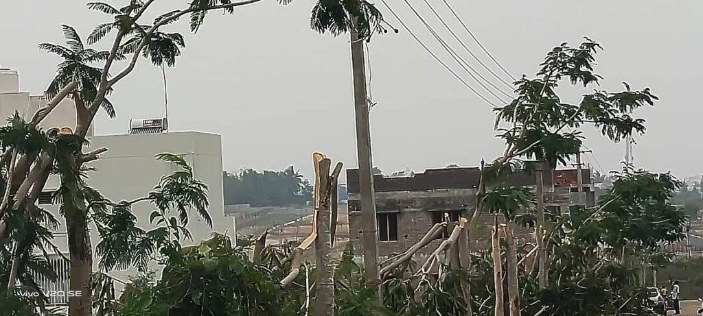 ಮೈಸೂರಿನ ಆರ್.ಟಿ. ನಗರ ಬಡಾವಣೆಯ ಟ್ರಾಕ್ವಿಲ್ ಲೇಔಟ್ ನಲ್ಲಿ ಕಳೆದ ಕೆಲ ವರ್ಷಗಳಿಂದ ಬೆಳೆಸಲಾಗಿದ್ದ ಮರದ ರೆಂಬೆ, ಕೊಂಬೆಗಳು ಇದೀಗ ಸೆಸ್ಕಾಂ ಸಿಬ್ಬಂದಿಯಿಂದ ನೆಲಕ್ಕುರುಳಿ ಬೋಳಾಗಿವೆ.ಪರಿಸರದ ಬಗ್ಗೆ ಕನಿಷ್ಠ ಜ್ಞಾನವಿಲ್ಲದ ಸೆಸ್ಕಾಂ ಸಿಬ್ಬಂದಿಗಳ ಈ ನಡೆಗೆ ಸ್ಥಳೀಯರು ಆಕ್ರೋಶ ವ್ಯಕ್ತಪಡಿಸಿದ್ದಾರೆ.