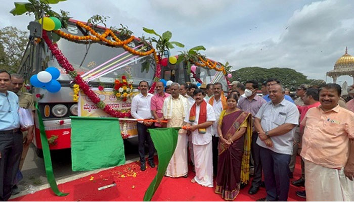 ವಿಶ್ವ ವಿಖ್ಯಾತ ನಾಡಹಬ್ಬ ಮೈಸೂರು ದಸರಾವನ್ನು ನೋಡಿರದ ಗ್ರಾಮೀಣ ಜನತೆಗೆ ದಸರಾ ವೀಕ್ಷಿಸಲು ಕರ್ನಾಟಕ ರಾಜ್ಯ ರಸ್ತೆ ಸಾರಿಗೆ ನಿಗಮದ ವತಿಯಿಂದ ಹಮ್ಮಿಕೊಂಡಿರುವ “ದಸರಾ ದರ್ಶನ” ಕಾರ್ಯಕ್ರಮಕ್ಕೆ ಸಹಕಾರ ಹಾಗೂ ಮೈಸೂರು ಜಿಲ್ಲಾ ಉಸ್ತುವಾರಿ ಸಚಿವರಾದ ಎಸ್.ಟಿ.ಸೋಮಶೇಖರ್ ಅವರು ಹಸಿರು ಬಾವುಟ ತೋರುವ ಮೂಲಕ ಚಾಲನೆ ನೀಡಿದರು.