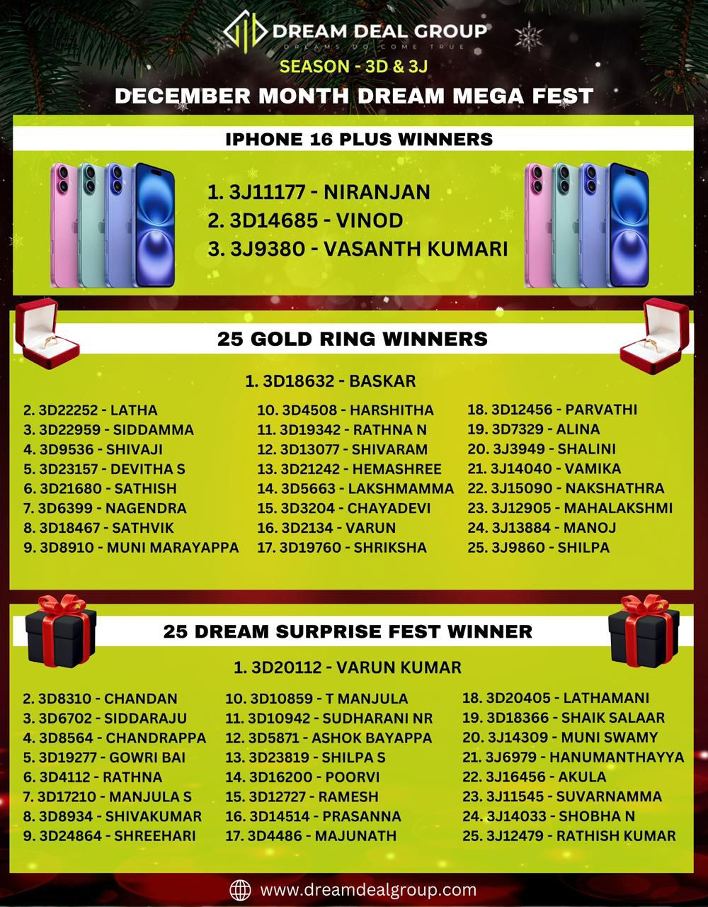 ಈ ಲಕ್ಕಿ ಡ್ರಾದಲ್ಲಿ  ಐಫೋನ್ 16 ಪ್ಲಸ್– 3 ಜನರಿಗೆ, ಬಂಗಾರದ ಉಂಗುರಗಳು– 25 ಜನರಿಗೆ, ಅಚ್ಚರಿಯ ಉಡುಗೊರೆಗಳು –ಮತ್ತೊಂದು 25 ಜನರಿಗೆ ವಿತರಿಸಲಾಯಿತು. ಒಟ್ಟು 53 ಜನ ಭಾಗ್ಯಶಾಲಿ ವಿಜೇತರಿಗೆ ಲಕ್ಕಿ ಡ್ರಾ ಮೂಲಕ ಬಹುಮಾನ ಲಭಿಸಿತು.
