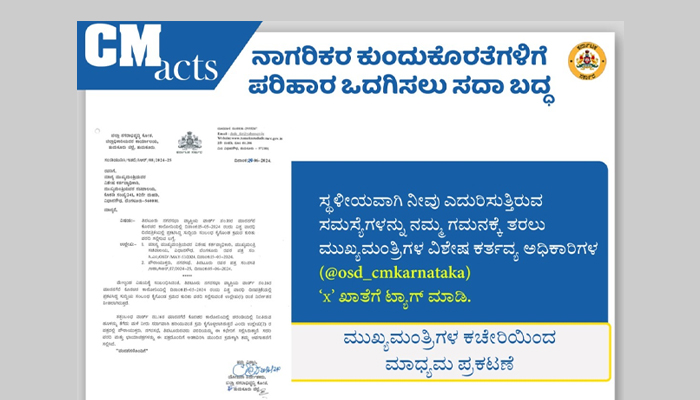 ಇನ್ನೂ ಸಾರ್ವಜನಿಕರು ಸ್ಥಳೀಯವಾಗಿ ಎದುರಿಸುತ್ತಿರುವ ಸಮಸ್ಯೆಗಳನ್ನು ಗಮನಕ್ಕೆ ತರಲು @osd_cmkarnataka ಎಕ್ಸ್ ಖಾತೆಗೆ ಟ್ಯಾಗ್ ಮಾಡಬಹುದಾಗಿದೆ.