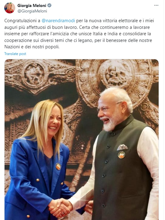 ಪ್ರಧಾನಿ ಮೋದಿಗೆ ಶುಭ ಹಾರೈಸಿದ ಇಟಲಿ ಪ್ರಧಾನಿ ಮೆಲೋನಿ