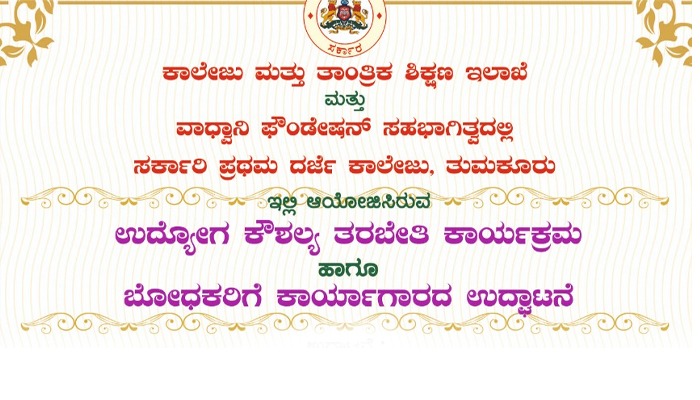 ತುಮಕೂರು: ಉದ್ಯೋಗ ಕೌಶಲ್ಯ ತರಬೇತಿ ಹಾಗೂ ಬೋಧಕರಿಗೆ ಕಾರ್ಯಾಗಾರದ ಉದ್ಘಾಟನಾ ಕಾರ್ಯಕ್ರಮವು ಮಾರ್ಚ್ 11ರ ಸೋಮವಾರ ಬೆಳಿಗ್ಗೆ 9:30 ಗಂಟೆಗೆ ಸರ್ಕಾರಿ ಪ್ರಥಮ ದರ್ಜೆ ಕಾಲೇಜಿನಲ್ಲಿ ಜರುಗಲಿದೆ ಎಂದು ಪ್ರಾಂಶುಪಾಲರಾದ ಪ್ರೊ.ತರನ್ನುಂ ನಿಖತ್ ಎಸ್. ತಿಳಿಸಿದ್ದಾರೆ.