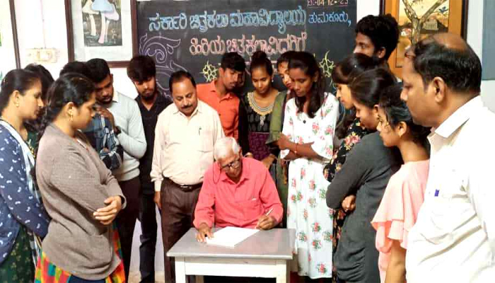 ಸರ್ಕಾರಿ ಚಿತ್ರಕಲಾ ಮಹಾವಿದ್ಯಾಲಯದ ಪ್ರಾಂಶುಪಾಲರಾದ ಸಿ.ಸಿ.ಬಾರಕೇರ ಮಾತನಾಡಿ, ವಿದ್ಯಾರ್ಥಿಗಳು ಹಿರಿಯ ಕಲಾವಿದರ ಕೃತಿಗಳನ್ನು ನೋಡುವುದರ ಜೊತೆಯಲ್ಲಿ ಮುಕ್ತವಾಗಿ ಕಲಾಕೃತಿ ಬಗ್ಗೆ ಚರ್ಚೆ ನಡೆಸಬೇಕು. ನಾವು ನೋಡುವ ಭಿನ್ನತೆಯಲ್ಲಿ ಚಿತ್ರಗಳು ಕಣ್ಣಿಗೆ ಬೀಳುತ್ತವೆ. ಗುರು-ಹಿರಿಯ ಮಾರ್ಗದರ್ಶನ ಪಡೆದು ಸಮಾಜದಲ್ಲಿ ಒಬ್ಬ ಕಲಾವಿದ ಅಥವಾ ಕಲಾ ಶಿಕ್ಷಕನಾಗುವ ಗುರಿ ಇಟ್ಟುಕೊಳ್ಳಬೇಕು. ನನ್ನ ಗುರುಗಳಾದ ಎಂ.ಆರ್.ಬಾಳಿಕಾಯಿ ಅವರಿಂದ ಕಲಿತ ವಿದ್ಯೆಯಿಂದ ನಾನಿಂದು ಗೌರವ ಸ್ಥಾನದಲ್ಲಿದ್ದೇನೆ ಅದು ನನಗೆ ಹೆಮ್ಮೆಯ ವಿಷಯವಾಗಿದ್ದು, ತಾವುಗಳು ಕೂಡ ಇಂತಹ ಉತ್ತಮ ಮಾರ್ಗದಲ್ಲಿ ಸಾಗಬೇಕಿದೆ ಎಂದು ವಿದ್ಯಾರ್ಥಿಗಳಿಗೆ ಕರೆ ನೀಡಿದರು.