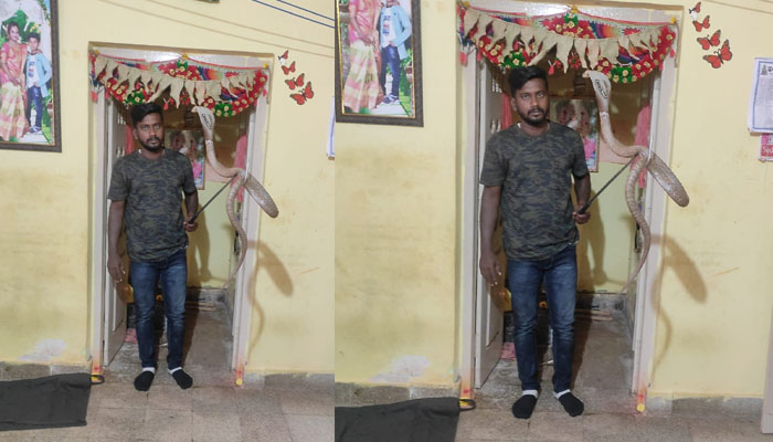 ಇಲ್ಲಿನ ನಿವಾಸಿ ಸಿದ್ದರಾಜು ಎಂಬುವವರ ಮನೆಯ ದೇವರ ಕೋಣೆಯಲ್ಲಿ ಬೃಹತ್ ಗಾತ್ರದ ನಾಗರಹಾವು ಕಾಣಿಸಿಕೊಂಡಿತ್ತು. ದೇವರ ಮನೆಯಲ್ಲಿ ಪೂಜೆ ಮಾಡಲು ಸಿದ್ದರಾಜು ಅಲ್ಲಿ ಅವಿತು ಕುಳಿತಿದ್ದ ನಾಗರಹಾವನ್ನು ಕಂಡಿದ್ದಾರೆ.