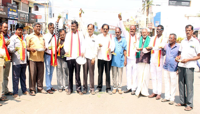 ನಗರದ ಶ್ರೀಚಾಮರಾಜೇಶ್ಚರ ಉದ್ಯಾನವನದ ಮುಂಭಾಗದಲ್ಲಿ ಕರ್ನಾಟಕ ಸೇನಾಪಡೆ ಅಧ್ಯಕ್ಷ ಚಾ.ರಂ.ಶ್ರೀನಿವಾಸಗೌಡ ಅವರ ನೇತೃತ್ವದಲ್ಲಿ  ಜಮಾಯಿಸಿದ  ಪ್ರತಿಭಟನಾಕಾರರು ಭುವನೇಶ್ವರಿ ವೃತ್ತದ ತನಕ ರ್ಯಾಲಿ ನಡೆಸಿ ರಾಷ್ಟ್ರೀಯ ಹೆದ್ದಾರಿ ತಡೆದು ಪ್ರತಿಭಟನೆ ನಡೆಸಿದರು.