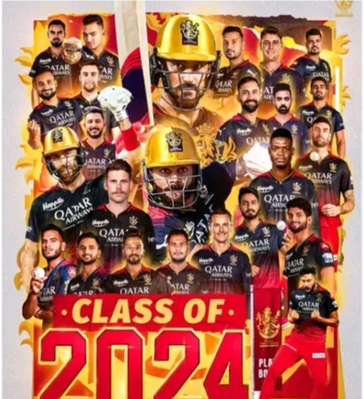 ತಂಡ: ಡುಪ್ಲೆಸಿಸ್ (ನಾಯಕ), ವಿರಾಟ್ ಕೊಹ್ಲಿ, ಗ್ಲೆನ್ ಮ್ಯಾಕ್ಸ್ವೆಲ್, ರಜತ್ ಪಾಟಿದಾರ್, ಅನುಜ್ ರಾವತ್, ದಿನೇಶ್ ಕಾರ್ತಿಕ್, ಸುಯಶ್ ಪ್ರಭುದೇಸಾಯಿ, ವಿಲ್ ಜಾಕ್ಸ್, ಮಹಿಪಾಲ್ ಲೊಮೋರ್, ಕರಣ್ ಶರ್ಮಾ, ಮನೋಜ್ ಭಾಂಡಗೆ, ಮಯಾಂಕ್ ದಾಗರ್, ವಿಜಯ್ಕುಮಾರ್ ವೈಶಾಕ್, ಆಕಾಶ್ ದೀಪ್, ಮೊಹಮ್ಮದ್ ಸಿರಾಜ್, ರೀಸ್ ಟೋಪಿ, ಹಿಮಾಂಶು ಶರ್ಮಾ, ರಾಜನ್, ಕ್ಯಾಮೆರೋನ್ ಗ್ರೀನ್, ಅಲ್ಪಾರಿ, ಯಶ್ ದಯಾಳ್ ಟಾಮ್ ಕಾನ್, ಲಾಕಿ ಫರ್ಗುಸನ್, ಸ್ವಪ್ಟಿಲ್, ಸೌರವ್ ಚೌಹಾಣ್.