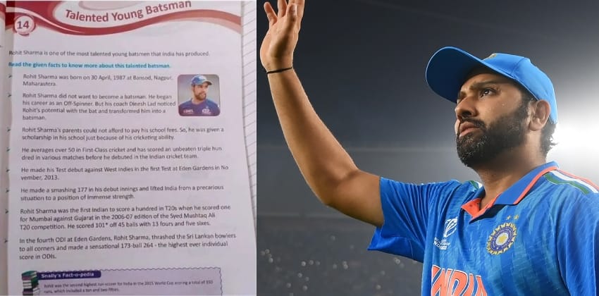ಭಾರತ ತಂಡದ ನಾಯಕ ರೋಹಿತ್ ಶರ್ಮಾ ಅವರ ಜೀವನ ಚರಿತ್ರೆ ಇರುವ ಶಾಲಾ ಪಠ್ಯ ಪುಸ್ತಕದ ಚಿತ್ರವೊಂದು ಸಾಮಾಜಿಕ ಜಾಲತಾಣದಲ್ಲಿ ವೈರಲ್ ಆಗಿದೆ. ಐಸಿಸಿ ಕ್ರಿಕೆಟ್ ವಿಶ್ವಕಪ್ 2023 ರಲ್ಲಿ ಅವರ ಪ್ರಭಾವಶಾಲಿ ಪ್ರದರ್ಶನದ ನಂತರ ಭಾರತೀಯ ನಾಯಕನ ಪಠ್ಯಪುಸ್ತಕ ಚಿತ್ರ ವೈರಲ್ ಆಗುತ್ತಿದೆ.