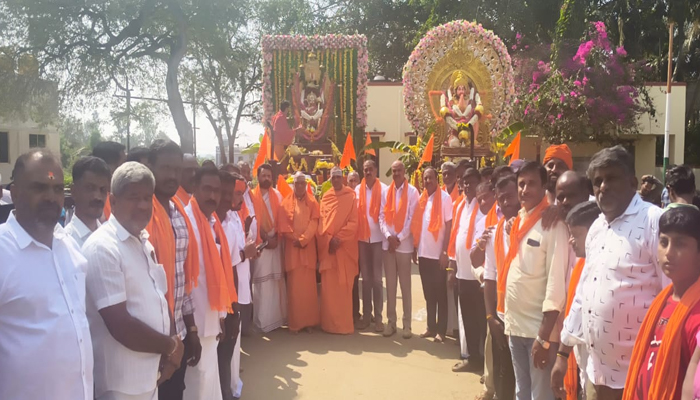 ಟ್ರ್ಯಾಕ್ಟರ್ಗಳಲ್ಲಿ ಉತ್ಸವ ಮೂರ್ತಿಗಳನ್ನು ಇಟ್ಟು ಶೋಭಯಾತ್ರೆ ನಡೆಸಲಾಯಿತು. ಕೇಸರಿ ಟೀ ಶರ್ಟ್, ಶಾಲು ತೊಟ್ಟು ಗುಂಪು ಗುಂಪಾಗಿ ಮೆರವಣಿಗೆಯಲ್ಲಿ ಭಕ್ತರು ಸಾಗಿದರು.