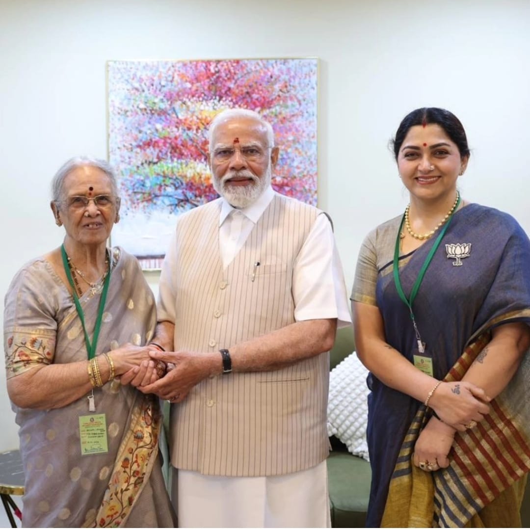 ಖುಷ್ಬೂ ಜೊತೆಗೆ ಆಕೆಯ ಅತ್ತೆ ದೇವನೈ ಚಿದಂಬರಂ ಪಿಳ್ಳೈ ಕೂಡ ಮೋದಿಯನ್ನು ಭೇಟಿ ಮಾಡಿದ್ದಾರೆ. ಈ ಸಂದರ್ಭದಲ್ಲಿ ಮೋದಿ ಅವರು ಖುಷ್ಬೂ ಅತ್ತೆಯ ಆಶೀರ್ವಾದ ಪಡೆದರು. ಮೋದಿಯನ್ನು ನೋಡಿ ತುಂಬಾ ಸಂತೋಷವಾಯಿತು. ಈ ಸಂದರ್ಭದಲ್ಲಿ ತೆಗೆದ ಫೋಟೋಗಳನ್ನು ಖುಷ್ಬೂ ತಮ್ಮ ಸೋಶಿಯಲ್ ಮೀಡಿಯಾದಲ್ಲಿ ಹಂಚಿಕೊಂಡಿದ್ದಾರೆ.