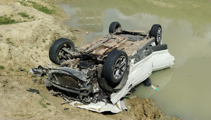 Home » ಡಿವೈಡರ್ ಗೆ ಗುದ್ದಿ ಕೆರೆಗೆ ಬಿದ್ದ ಕಾರು: ನಾಲ್ವರಿಗೆ ಗಾಯ