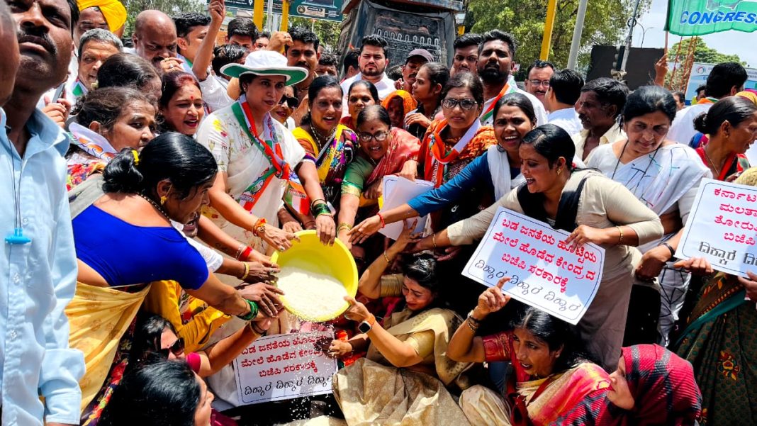 ಬೆಳಗಾವಿ ಜಿಲ್ಲಾ ಕಾಂಗ್ರೆಸ್ ವತಿಯಿಂದ ಕೇಂದ್ರ ಸರ್ಕಾರದ ವಿರುದ್ಧ ಬೃಹತ್ ಪ್ರತಿಭಟನಾ ರ್ಯಾಲಿ ನಡೆಸಲಾಯಿತು. ಮಹಿಳಾ ಮತ್ತು ಮಕ್ಕಳ ಕಲ್ಯಾಣ ಇಲಾಖೆ ಸಚಿವೆ ಲಕ್ಷ್ಮೀ ಹೆಬ್ಬಾಳ್ಕರ್ ಕೈಯಲ್ಲಿ ಅಕ್ಕಿ ಬುಟ್ಟಿ ಹಿಡಿದು ಪ್ರತಿಭಟನೆ ನಡೆಸಿದರು. ಕೇಂದ್ರ ಸರ್ಕಾರ ಅನ್ನಭಾಗ್ಯ ಯೋಜನೆಗೆ ಹೆಚ್ಚುವರಿ 5 ಕೆಜಿ ಅಕ್ಕಿ ನೀಡಲು ನಿರಾಕರಿಸಿರುವುದು ಖಂಡನೀಯ ಎಂದು ಕಿಡಿಕಾರಿದರು.