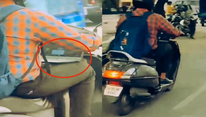 ಹೀಗೆ ಇದೀಗ ಜೀವನವೇ ಒಂದು ಒತ್ತಡವಾಗಿ ಪರಿಣಮಿಸಿದೆ. ಸಾಮಾನ್ಯವಾಗಿ ಕೆಲಸದ ಒತ್ತಡ ಇರುವ ಉದ್ಯೋಗಿ ಆಫೀಸು ಕ್ಯಾಬಿನಲ್ಲಿ, ಅಥವಾ ಹೋಟೆಲ್​ ಇನ್ನಿತರ ಸ್ಥಳಗಳಲ್ಲಿ ಕುಳಿತು ಕೆಲಸ ಮಾಡುವವರನ್ನು ಕಾಣಬಹುದು. ಅದರಲ್ಲೂ ಬೆಂಗಳೂರಿನಂತ ನಗರದಲ್ಲಿ ಇಂತಹ ದೃಶ್ಯ ಕಾಣಬಹುದು. ಆದರೆ ಇಲ್ಲೊಬ್ಬ ವ್ಯಕ್ತಿ ಸ್ಕೂಟರಿನಲ್ಲಿ ಪ್ರಯಾಣಿಸುತ್ತಾ ತನ್ನ ತೊಡೆಯ ಮೇಲೆ ಲ್ಯಾಪ್​ಟಾಪ್​ ಇರಿಸುತ್ತಾ ಆಫೀಸು ಕೆಲಸ ಮಾಡುತ್ತಾ ಹೋಗುತ್ತಿದ್ದಾನೆ. ಸದ್ಯ ಈ ದೃಶ್ಯ ಸಾಮಾಜಿಕ ಜಾಲತಾಣದಲ್ಲಿ ವೈರಲ್​ ಆಗಿದೆ.