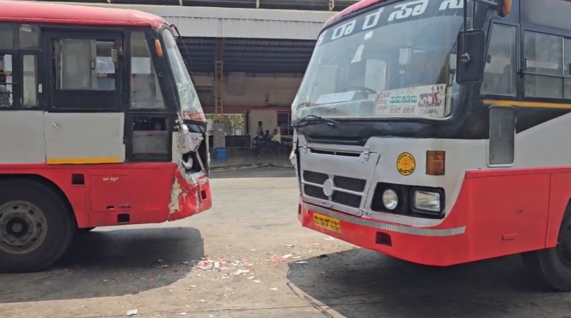 ಬಾನೆಟ್ ಮೇಲೆ ಕುಳಿತು ನಿದ್ರೆ ಮಾಡಿದ ಮಹಿಳೆಯರು: ಬಸ್ ನಿಲ್ದಾಣದಲ್ಲೇ ಎರಡು ಬಸ್ ಗಳ ನಡುವೆ ಅಪಘಾತ!